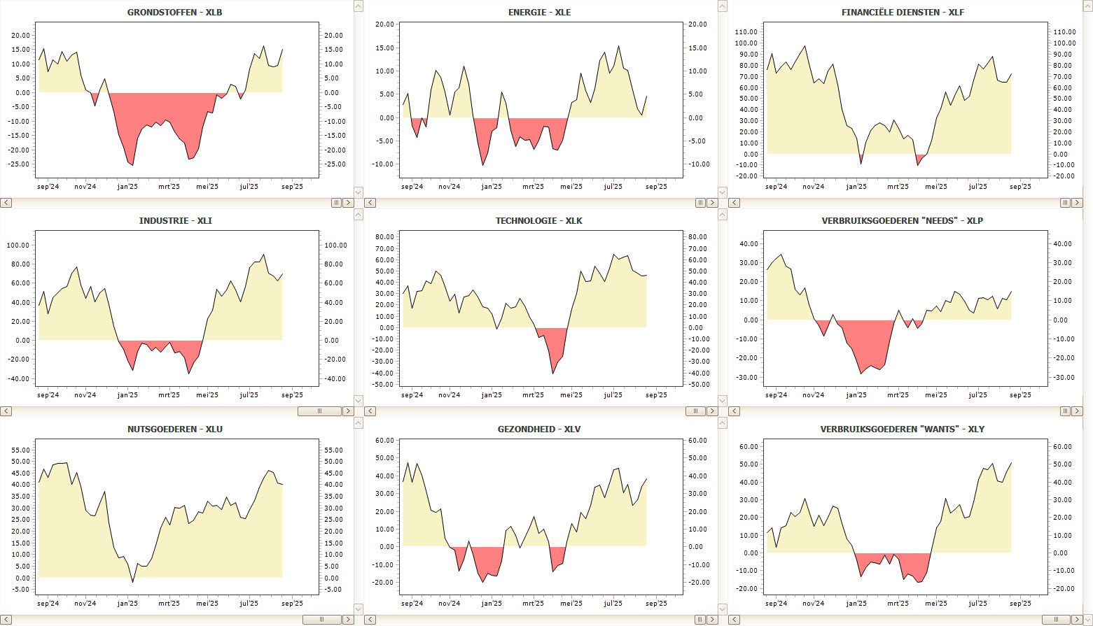 • Leiders: sectoren met stijgende RS lopen voorop; sectorrotatie helpt de volgorde te lezen.