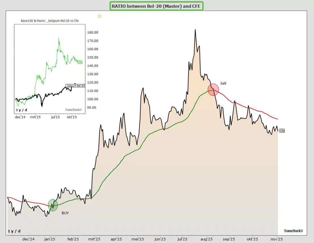 Ingezoomde RS-ratio grafiek tussen aandeel en benchmark geeft interessante in- en uitstapmomenten.