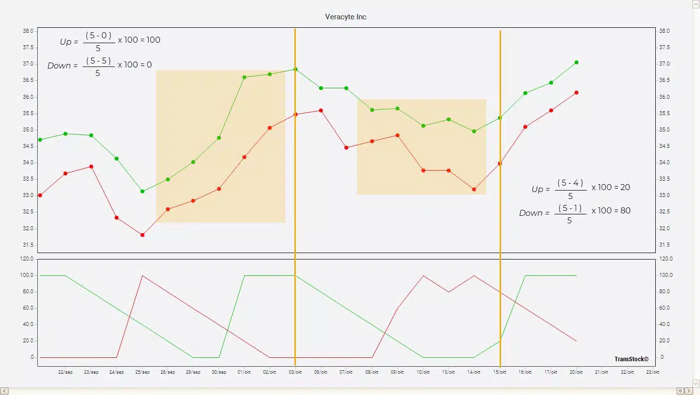Links in de grafiek ziet u het moment waarop de koers net een nieuw topje zette: Aroon Up = 100 en Aroon Down = 0.