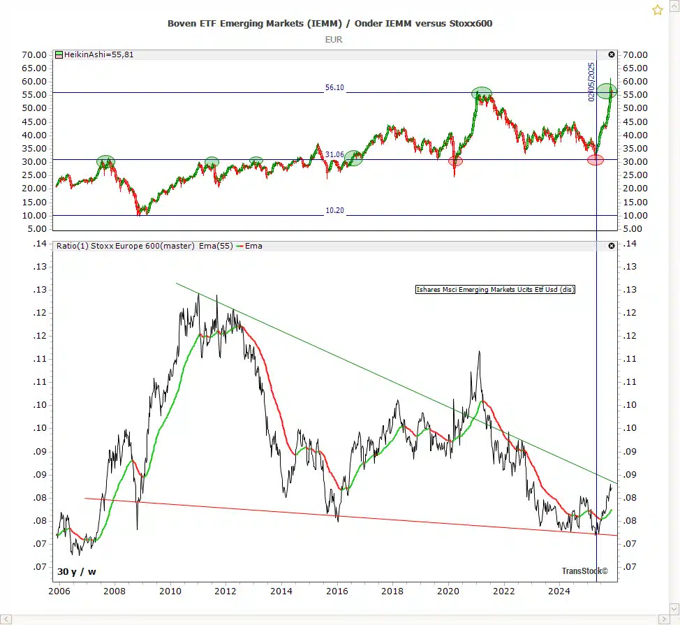 Kijkt u naar de verhouding tussen ETF emerging markets via de ETF IEMM tegenover Europa (Stoxx600), dan merkt u in het onderste deel van de grafiek dat deze ratio opnieuw een zone nadert die in het verleden meermaals als draaipunt fungeerde.