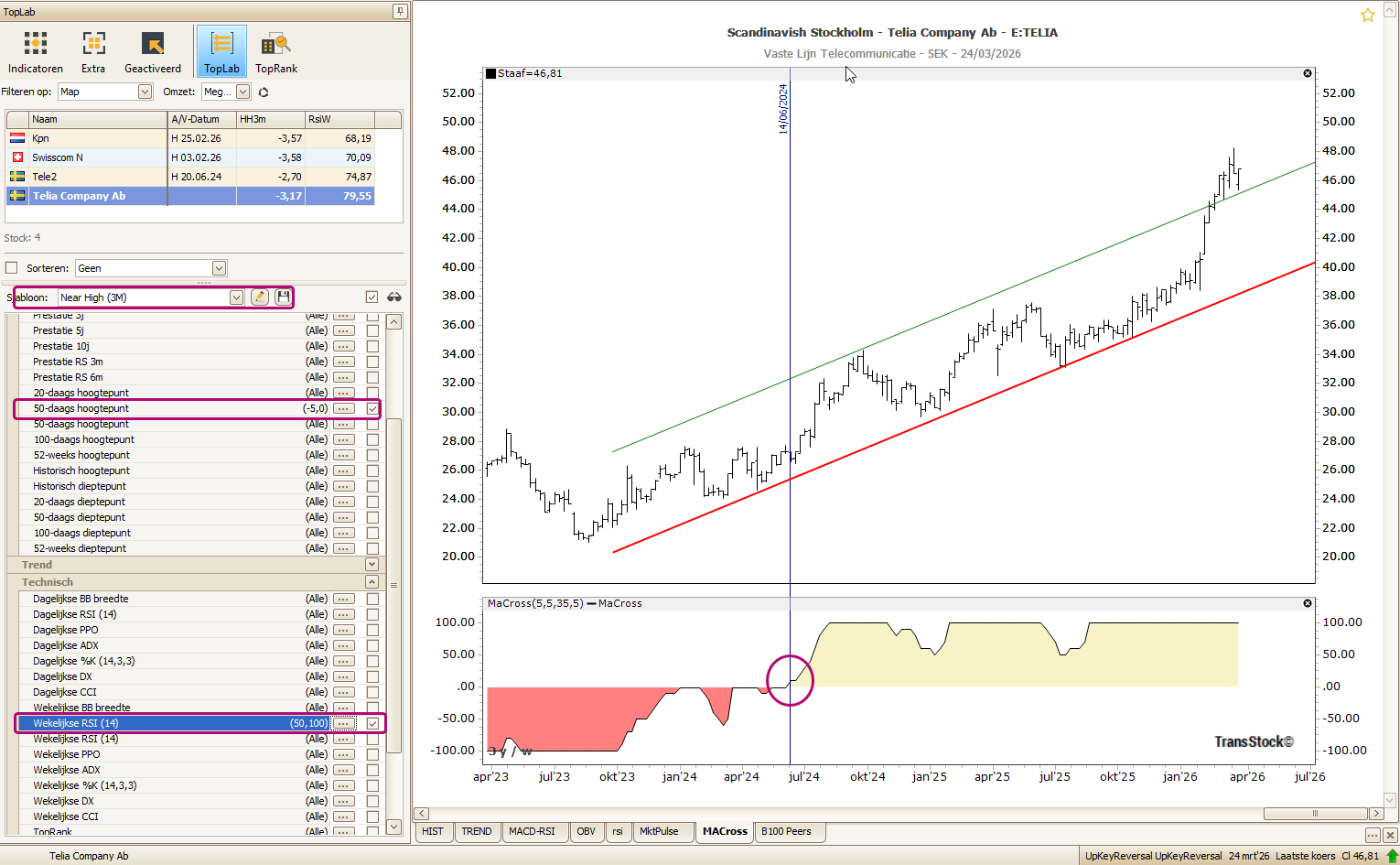 Wanneer u meerdere aandelen naast elkaar legt, merkt u dat de eerste signalen van kracht niet overal tegelijk verschijnen. In dit geval valt op dat onder meer Tele2, Telia, KPN en Swisscom relatief sterk presteren binnen de sector.