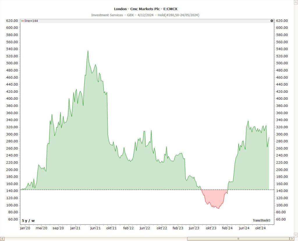 Visualiseert prijsbeweging t.o.v. een horizontale basislijn. Positieve zones boven de baseline worden lichtgroen, negatieve zones lichtrood weergegeven — ideaal voor snel trendgevoel en omkeringen.