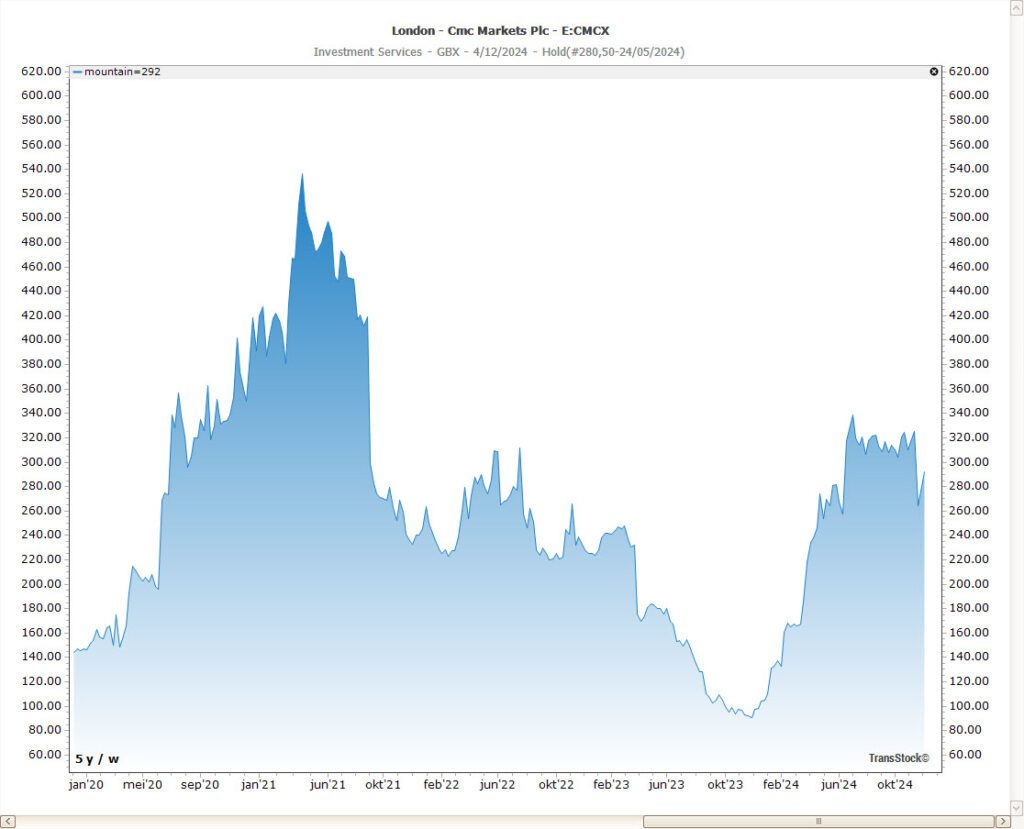 Een gevulde lijn (“bergprofiel”) die trendrichting en continuïteit helder toont — prettig leesbaar voor langere periodes of rustige opwaartse trajecten.