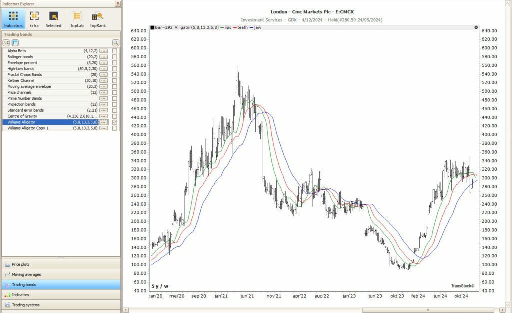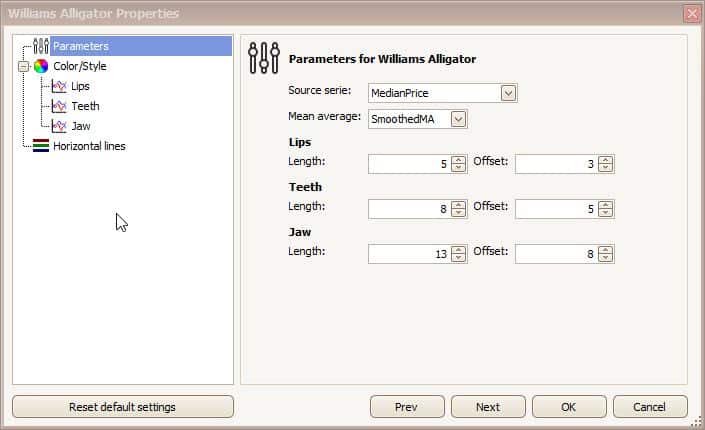 - Open de verkenner indicatoren → Trading Bands → Williams Alligator (aanvinken).