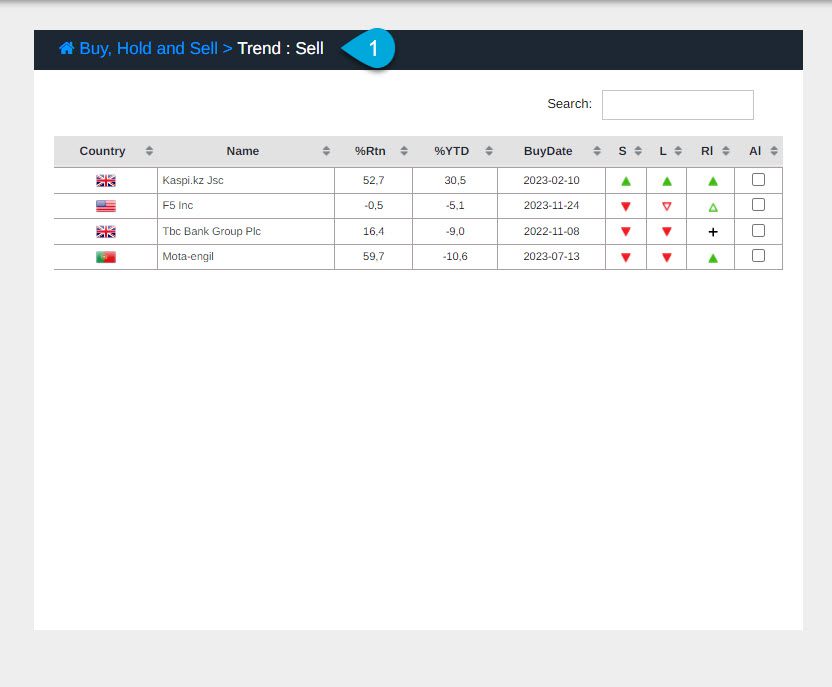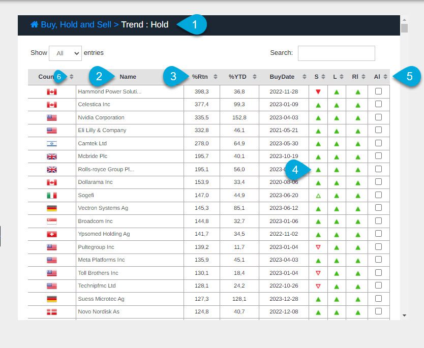 Onder Modelportefeuilles vindt u drie trendlijsten: Buy, Hold en Sell. Open het submenu met de pijl rechts. Met deze lijsten kunt u eenvoudig trend buy hold en sell signalen volgen en uw beslissingen verfijnen.