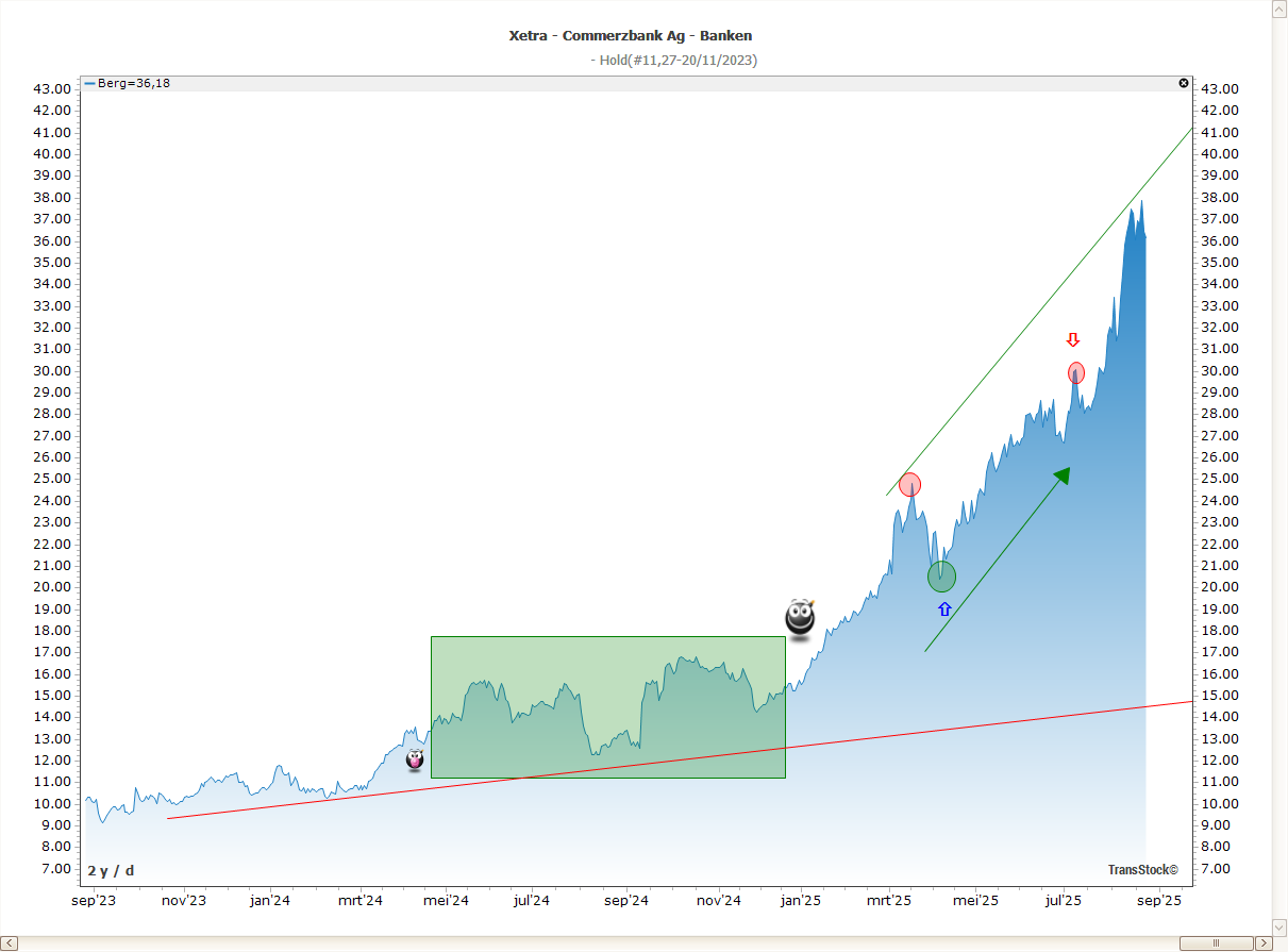- Pijlen & markeringen: instap, uitstap, uitbraak of retest.