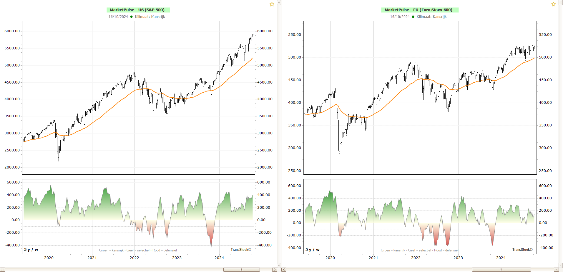Wilt u weten of de markt aantrekt of verzwakt? Met MarketPulse in TransStock volgt u in één oogopslag het marktmomentum. De curve onderaan de grafiek toont hoeveel aandelen stijgen of dalen in grote indices zoals S&P500 en EuroStoxx600.
