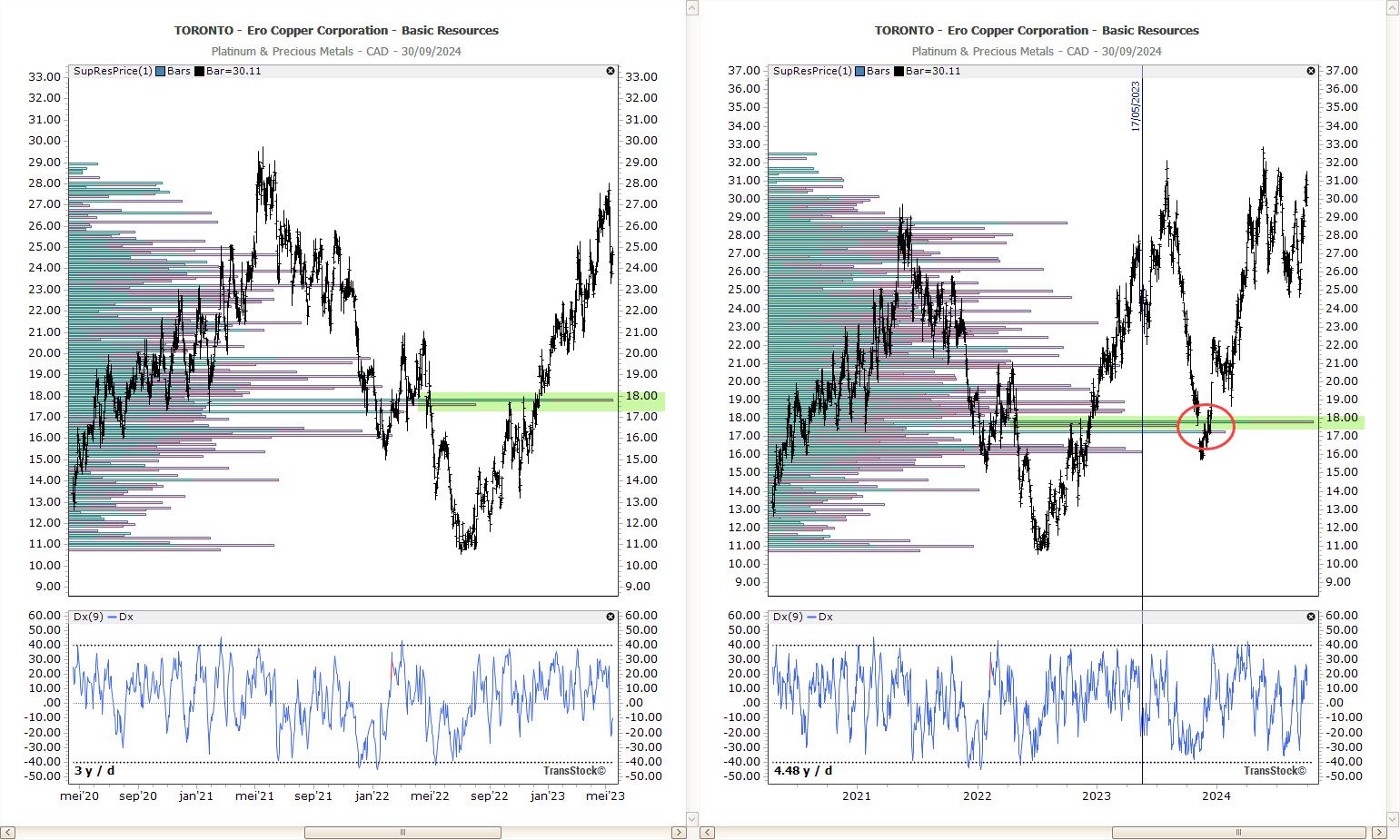 SUP-RES in TransStock combineert twee elementen: horizontale volumebalken in de prijsgrafiek en de Demand Index. Zo ziet u zowel waar de koop- en verkoopdruk zit, als wanneer deze omslaat.